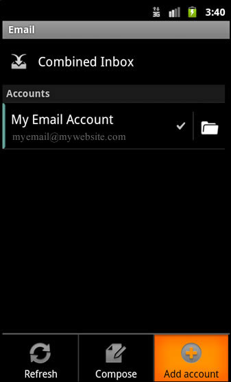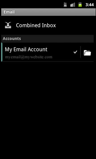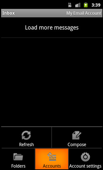 On this screen you will see your currently selected email account. Press the Menu button on your Android phone to bring up the display shown on the following screenshot, and select the `Accounts` tab: