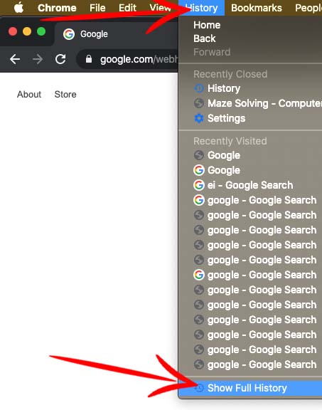 1) In Google Chrome, if you go to the top of your screen, you will see a button that says 'History', press that button to open the sub-menu. Then click 'Show full history' at the bottom of this sub-menu.