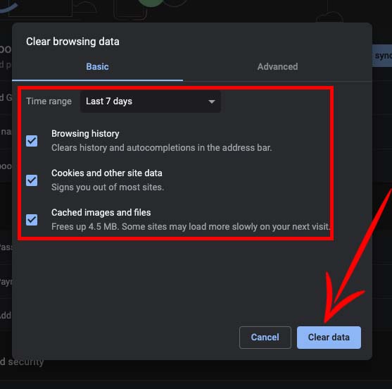 3) Clicking this link will bring up another window, showing all of the different types of data you can remove. Simply tick all the boxes as shown in the image below, and then press the 'Clear data' button.