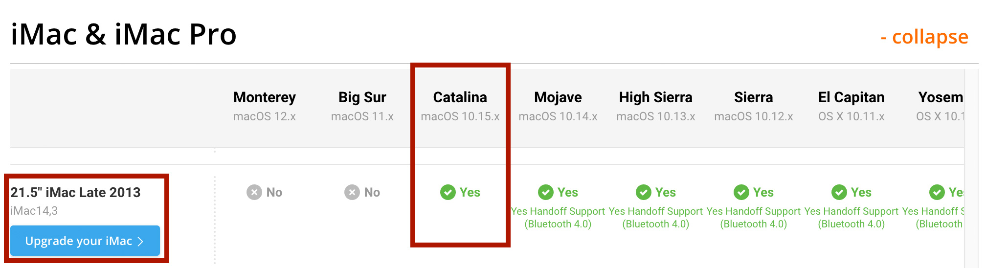 For example, if you have a Late 2013 21.5" iMac, then you'll see from the website above that the newest version of MacOS you can run is MacOS 10.15 Catalina
