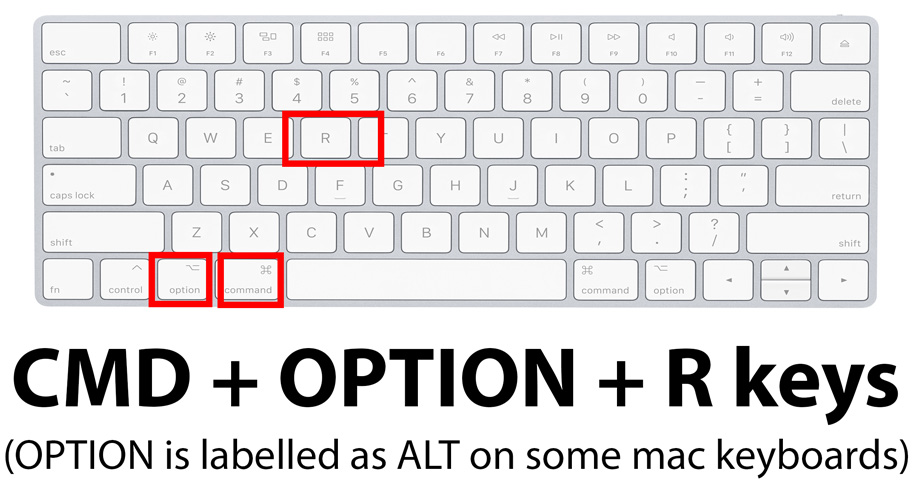 Press the CMD key, OPTION (sometimes lablled "ALT") key and the R key at the same time, as shown on the picture below.